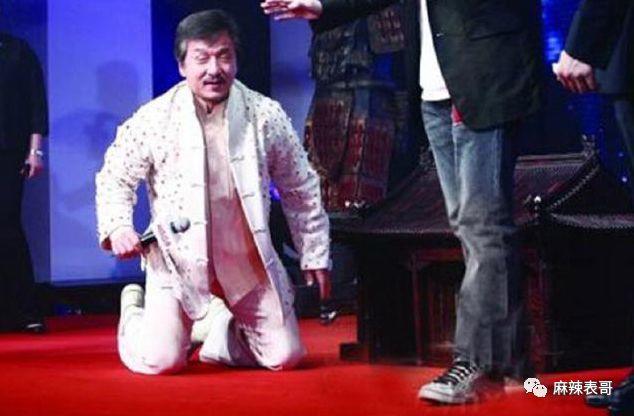 那下跪的照片是怎么回事?是成龙在某个展览会上看一个建筑模型时被拍到的。
