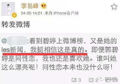 李易峰也莫名其妙转发了一个关于郭碧婷是les的微博。