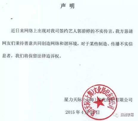 对此,郭碧婷的公司在2015年4月就曾出过声明,但说的很模糊。
