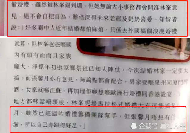 据港媒透露,如今张馨月一直以“准林太”的身份在香港筹备婚礼,虽然未婚夫林峯很宠爱她,但她都会常常问林峯意见;再加上此次婚礼属于终身大事,相信两人也会好好准备,港媒还补充道:该婚礼或将变成“马拉松式婚礼”,就是男方会在泉州和厦门办婚宴,而女家就会在盐城摆酒,除了这三个地方意外,两人还打算在欧洲行礼和在港设宴,一共是五个婚礼地点。