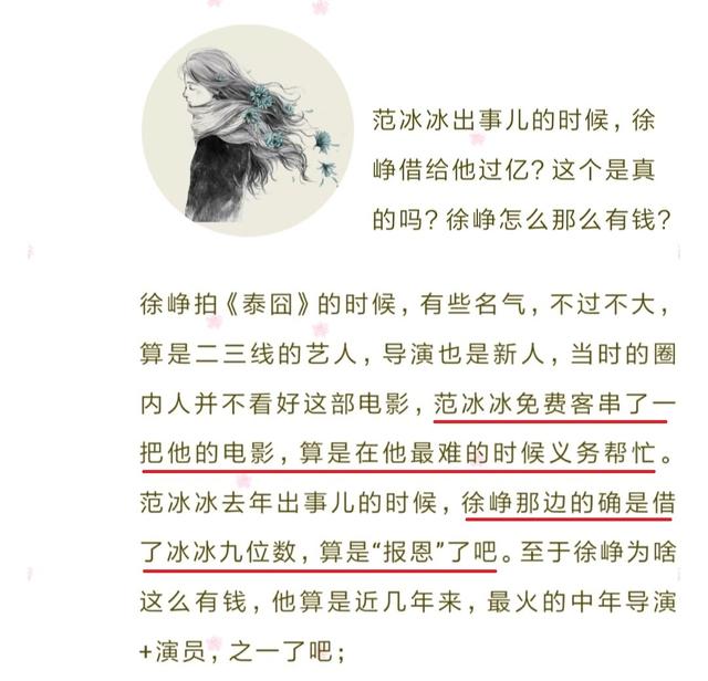 在前面我们就说了,范冰冰就是因为那件事,才变成现在这样,而有网友在网上爆料说,那件事情,范冰冰早就走出阴霾了,而帮助她走出难关的,就是她在圈内的好友,就拿徐峥来说,据说徐峥就借给了范冰冰9位数,差不多将近一个亿。