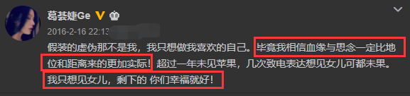 反倒是亲妈葛荟婕对小苹果没有任何祝福,但是葛荟婕在网络上因为章子怡小苹果的关系经常会出面撕逼,前段时间还发文暗讽章子怡生二胎是在繁殖,对于小苹果和她的关系她一直很有信心,2016年因为章子怡小苹果秀母爱,当时葛荟婕就发声对章子怡“毕竟我相信血缘与思念一定比地位和距离来的更加实际”。