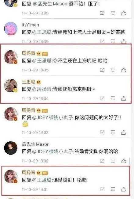 据悉,周扬青和王思聪是一个圈子的,两人是关系特别好的朋友。这位网友爆料这个消息之后,引起了很多网友的关注。不少网友还扒出了周扬青早期的微博内容,找到了周扬青与王思聪两个人之间的互动内容。
