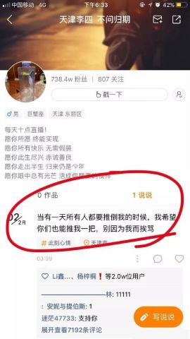 天津李四凌晨3点多发表说说表示“当有一天所有人都要推到我的时候,我希望你们也能推我一把,别因为我而挨骂”!