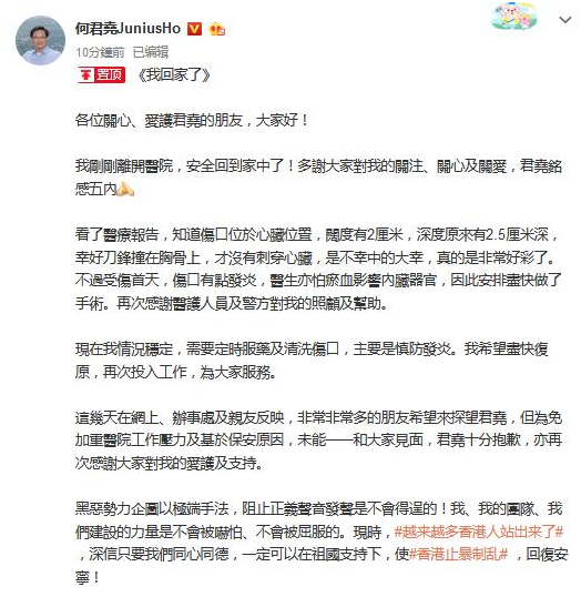 【环球网报道记者李东尧】8日下午早些时候,多家港媒报道了香港立法会议员何君尧入院治疗两天后出院的消息。刚刚,何君尧在微博上发布长文向网友报平安,“我刚刚离开医院,安全回到家中了!”何君尧透露自己现在情况稳定,“我希望尽快复原(康复),再次投入工作,为大家服务。”