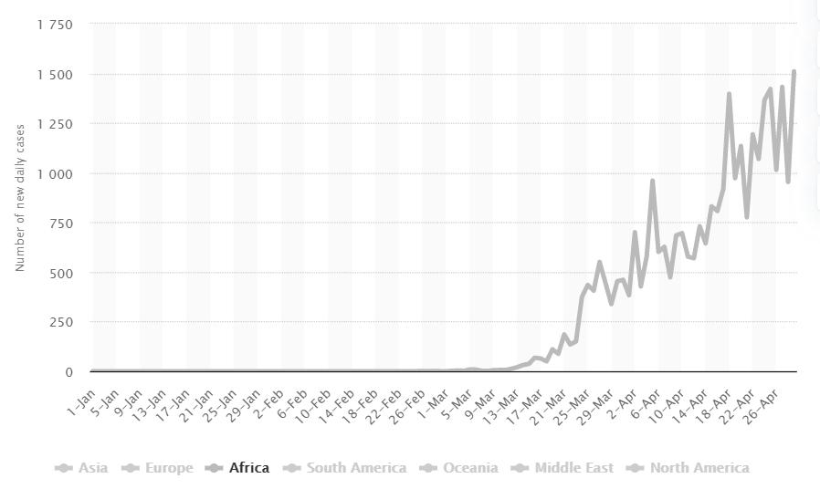 非洲地区,已至少有53个国家发生疫情。据非洲疾病预防控制中心最新疫情数据显示,非洲地区非洲国家目前确诊病例超过3.7万,累计死亡人数1598例。北非和西非地区疫情最为严重,确诊病例占整个非洲地区确诊病例的65%以上。