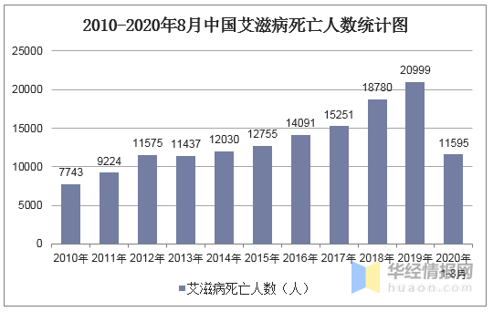 2020年1-8月中国艾滋病发病数量为39349例,死亡人数为11595人;2019年中国艾滋病发病数量为71204例,死亡人数为20999人。