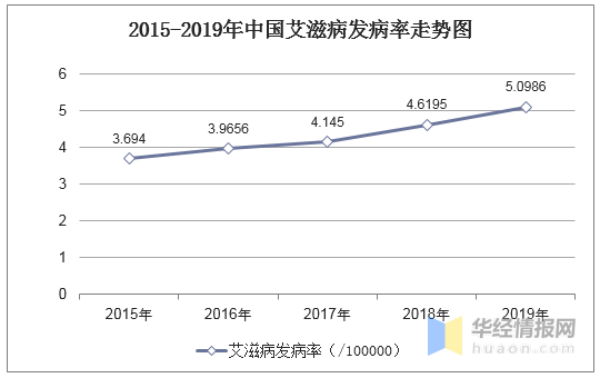 2019年中国艾滋病发病率为5.0986/10万,死亡率为1.5036/10万;2018年中国艾滋病发病率为4.6195/10万,死亡率为1.352/10万。