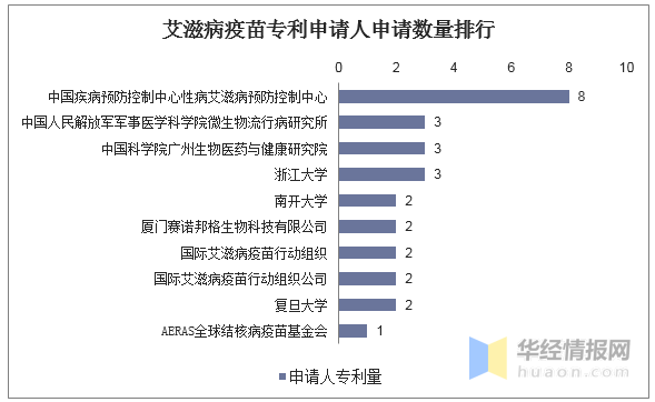 2011-2019年中国艾滋病疫苗专利哀求量共计25件,其中中国疾病防范控制中心性病艾滋病防范控制中心哀求数量达8件,位列第一;中国大众束厄局促军军事医学科学院微生物流行病研究所、中国科学院广州生物医药与健康研究院、浙江大学各哀求3件,并列第二。