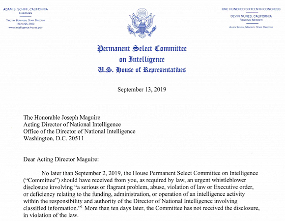 众院情报委员会主席希夫给代理情报总监马奎尔的信。