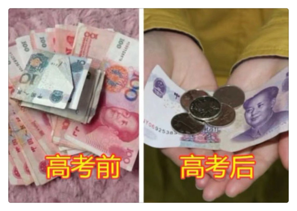 然后是零花钱方面,高考前只要不是太过分的要求家长一般都会满足,生怕你在学校或者在外面钱不够花,可着劲给,三天两头问还有没有钱花,再来看高考后,这一把零钱看着让人心酸,还想像之前那样随便花可是没那么容易了。