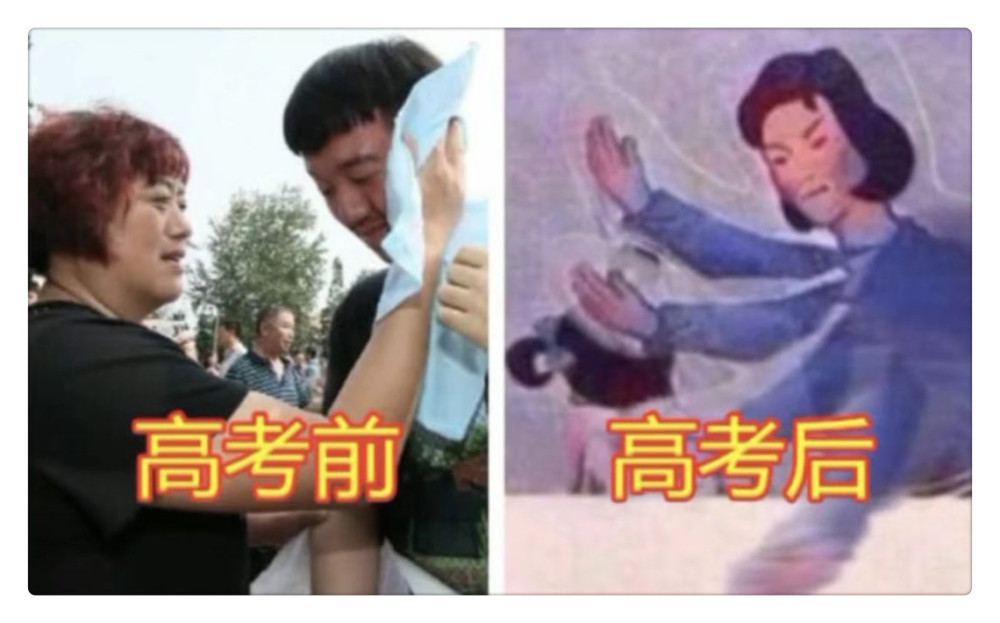 最后来看这张图,高考前自己出汗妈妈还拿着毛巾给你擦汗,生怕你有一点不舒服在影响高考,照顾的可是无微不至,再来看高考后,动作是一样的动作,性质可是天差地别,有一点惹到妈妈生气,巴掌伺候。
