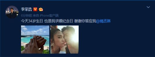 没想到不过多久,李荣浩晒出钻戒照,宣布成功求婚杨丞琳的喜讯:“今天34岁生日,也是我求婚纪念日,谢谢你答应我”。