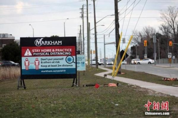当地时间4月11日,复活节假期,加拿大大多伦多地区万锦市公路边竖有醒目的告示牌,提醒民众注意保持物理距离,防止病毒传播。中新社记者余瑞冬摄