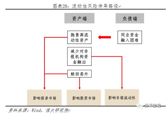 风险可能会出自哪里?流动性风险传导路径:首先,一旦部分中小银行同业资金融入出现问题,出现小面积流动性压力,银行则会率先在资产端抛售流动性较高资产,利率债等资产抛压加大。其次,由于我国存在流动性分层,流动性链条由大行传导至中小银行,再传导至非银金融机构,刚兑打破后,银行间市场资金融通对于交易对手信用资质要求急剧收紧,对于质押券信用等级要求提高,部分主体信用较弱的非银机构、及所持债券等级较低的金融产品资金融通压力迅速上行。最后,中小银行委外业务规模较大,一旦银行间市场流动性持续紧张,委外业务赎回压力加大,将带来非银机构抛售股票及债券资产,放大风险。