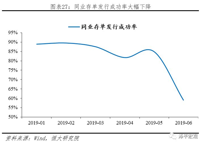 包商银行被接管后,对市场情绪产生了一定的冲击。首先,银行作为信用主体的刚兑预期被打破,同业资金无法实现全额兑付,大量银行重新对同业交易对手库进行清理,部分资质较差的中小银行同业资金融通难度加大。从近期同业存单发行成功率来看,2019年前5月均超过80%,6月以来随着此事件发酵,同业存单发行成功率锐减至59%。