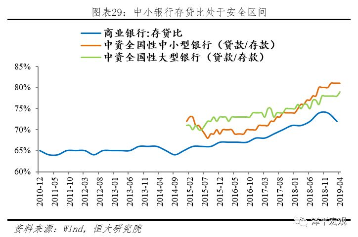 然而大规模信用收缩风险发生的可能性有限。首先,信用收缩风险基于流动性风险扩大,当前央行积极呵护中小银行流动性,且近期加大对于中小银行同业存单发行的支持力度,流动性风险难以大规模发生。其次,当前我国银行业整体存贷比处于安全区间,虽然中小银行近年加大对于同业负债的依赖程度,然而我们通过将金融机构信贷收支表中的贷款及存款数据进行简单处理可以看出,中小银行贷款/存款比例不超过80%,即只要存款规模稳定,外部的流动性冲击难以实质影响到贷款投放。