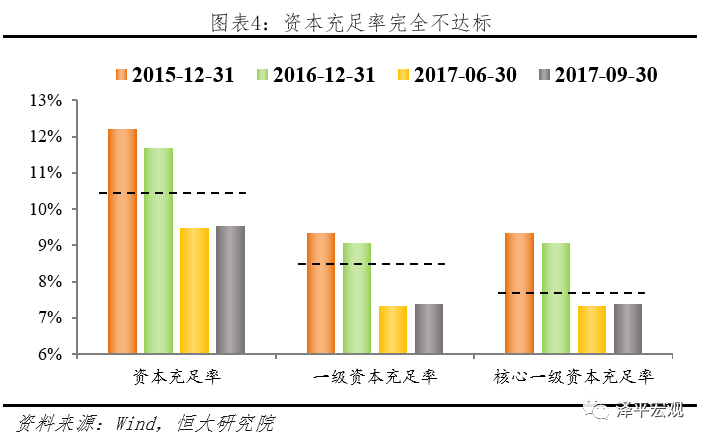 第四,资本充足水平方面,包商银行的资本补充压力巨大。截至2017年3季度末,其资本充足率为9.5%,已无法满足10.5%的监管要求;核心一级资本充足率为7.4%,也低于7.5%的监管要求。