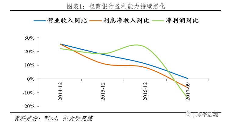 第一,盈利能力方面,包商银行盈利能力持续恶化,其营业收入、利息净收入和净利润同比增速明显下降,分别由2014年末的25.5%、25.3%、22.1%持续下降至2017年三季度末的0.5%、-6.3%、-13.9%。