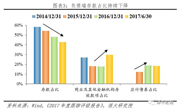 第三,近年来,包商银行同业业务和金融市场业务迅速发展,对同业资金的依赖程度高,同业负债占比偏高,业务调整压力大。截至2017年二季度末,未包括同业存单的同业负债占比达32.24%,其中,同业及其他金融机构存放款项占比为29.9%,较2016年末大幅上升12.1%。而存款占比则由2014年末的58.4%持续下滑至2017年二季度的42.8%。