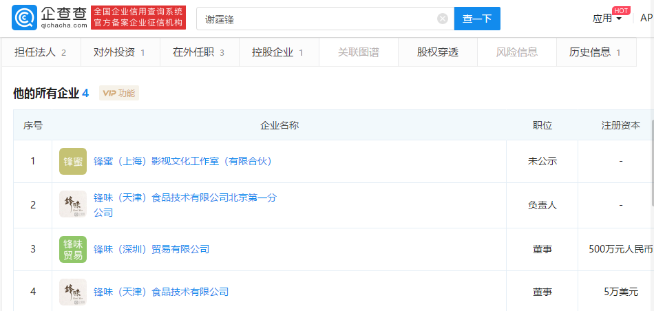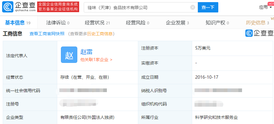 企查查显示,2016年锋味(天津)食品技术有限公司创立,注册资本5万美元。