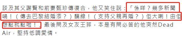 此前记者采访他关于父亲谢贤和前妻甄珍复婚的传闻,他好像完全不知情似的,先是反问记者这是什么时候的新闻,然后说他都那么大了,想做什么都可以,仿佛无所谓一般。