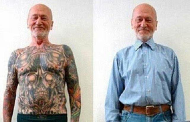 一位曾经文身的老爷爷,穿上衣服就会变成一个绅士。左右两边的对比,大家是不是觉得差距非常大了。文身的图案无论是文字抑或图案,文身总是为了取悦自己和别人,不管你文在哪里。那么,看完这个你们还想要文身吗?