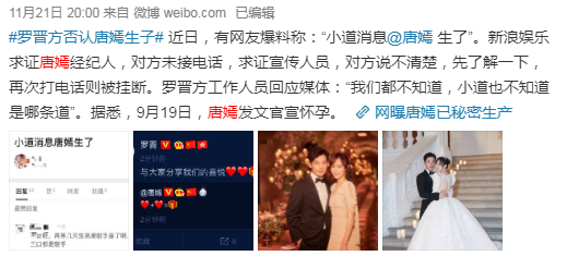 其实这已经是第二次传出唐嫣生下宝宝了,在11月21日就已经传出了一次,当时媒体求证了罗晋工作人员,对方否认唐嫣生了,这次距离上次的澄清不到20天,是否真的如小道消息生了呢?