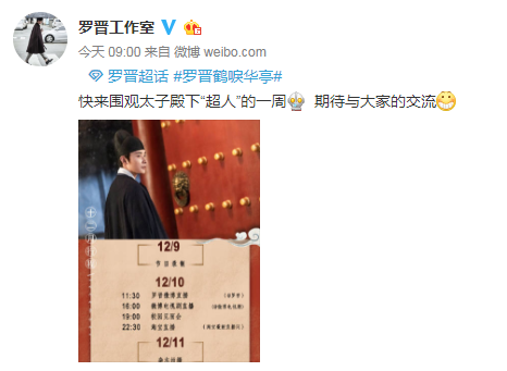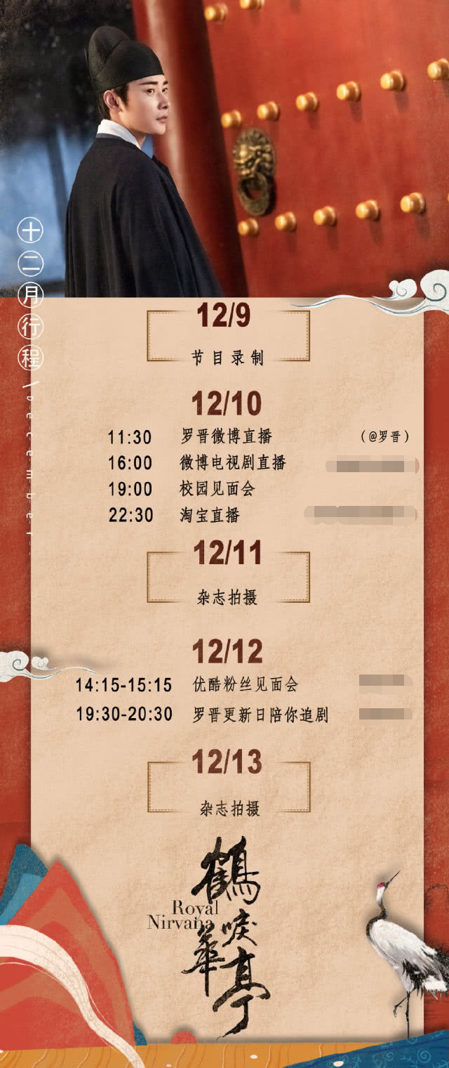 行程单中,罗晋12月9日全天有节目录制,12月10从中午11点30半一直到晚上十点半都是有工作的(中间有休息时间),三场直播外加校园见面会,12月11日杂志拍摄,12月12日下午两点到三点,晚上七点半到八点半,是见面会和陪你追剧。12月13日同样是杂志拍摄。